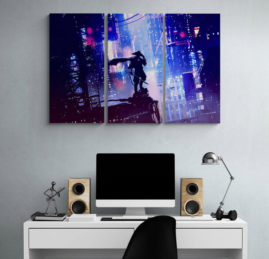 Japanese Samurai in Cyberpunk Futuristic City of Japan Wall Canvas Art (3 Piece Canvas). #C6452