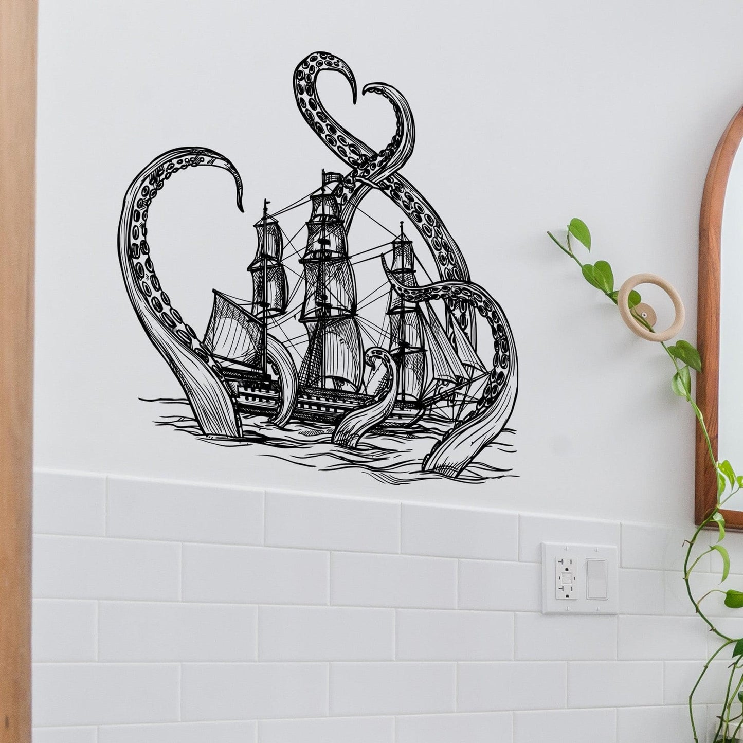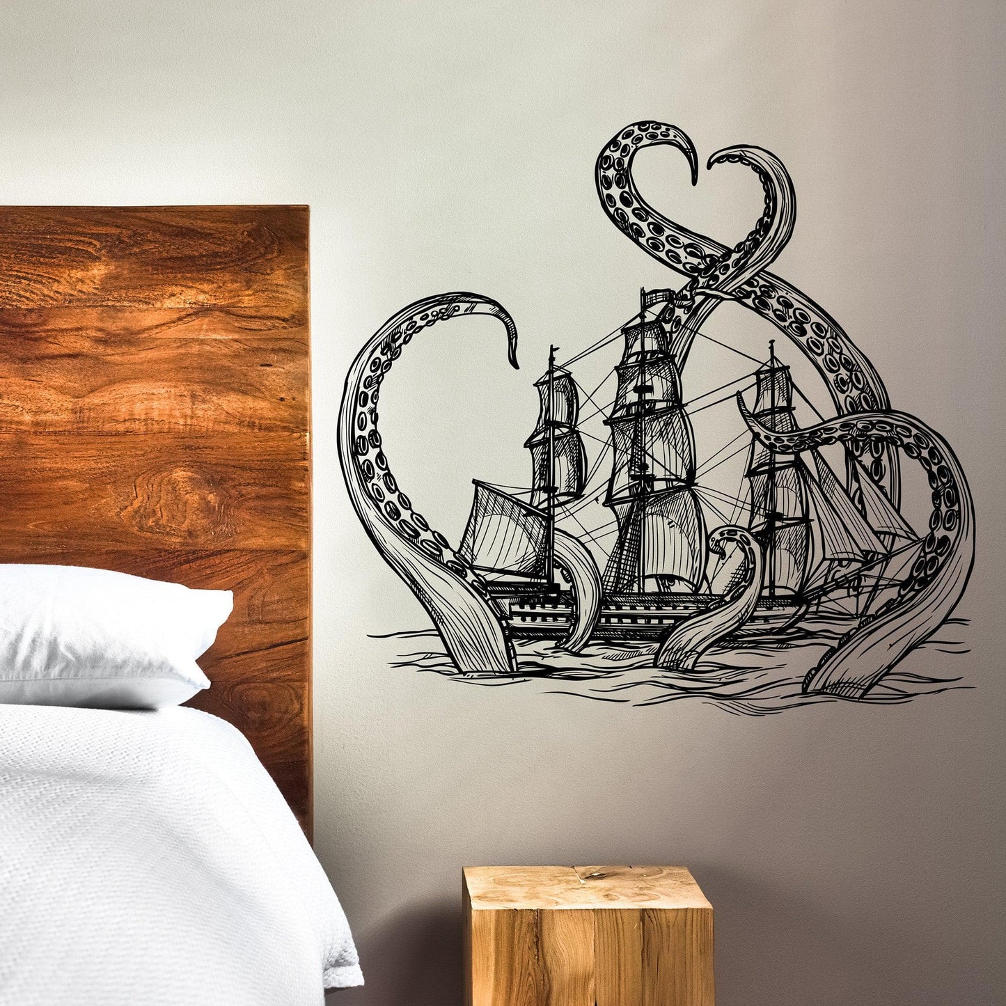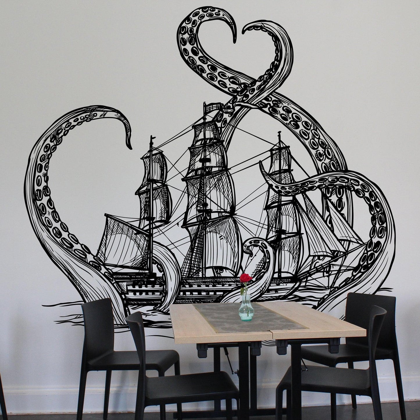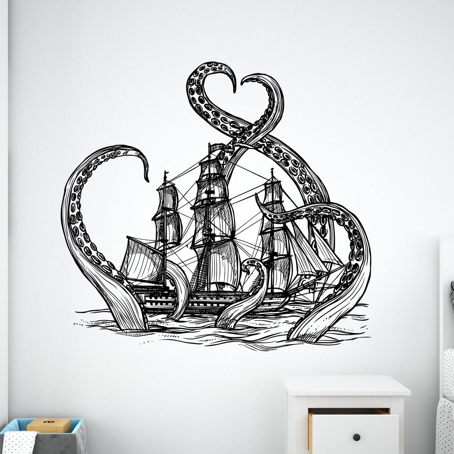 Embark on an epic adventure with our Giant Octopus Attacks Ship in Ocean Wall Decal. This Kraken-themed decor transforms your kid's room into a thrilling maritime world, perfect for little adventurers who dream of the high seas.
