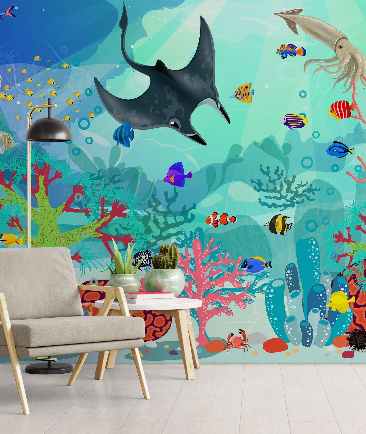 - Tropical underwater sea life wall mural design.