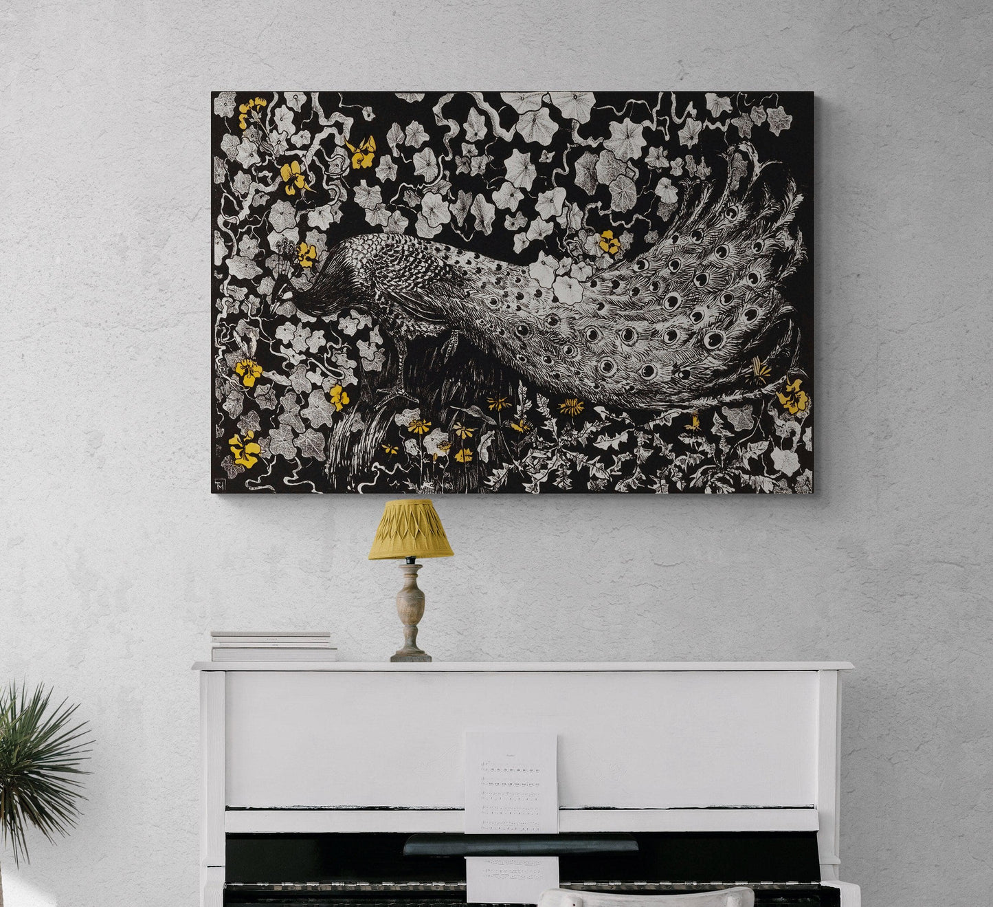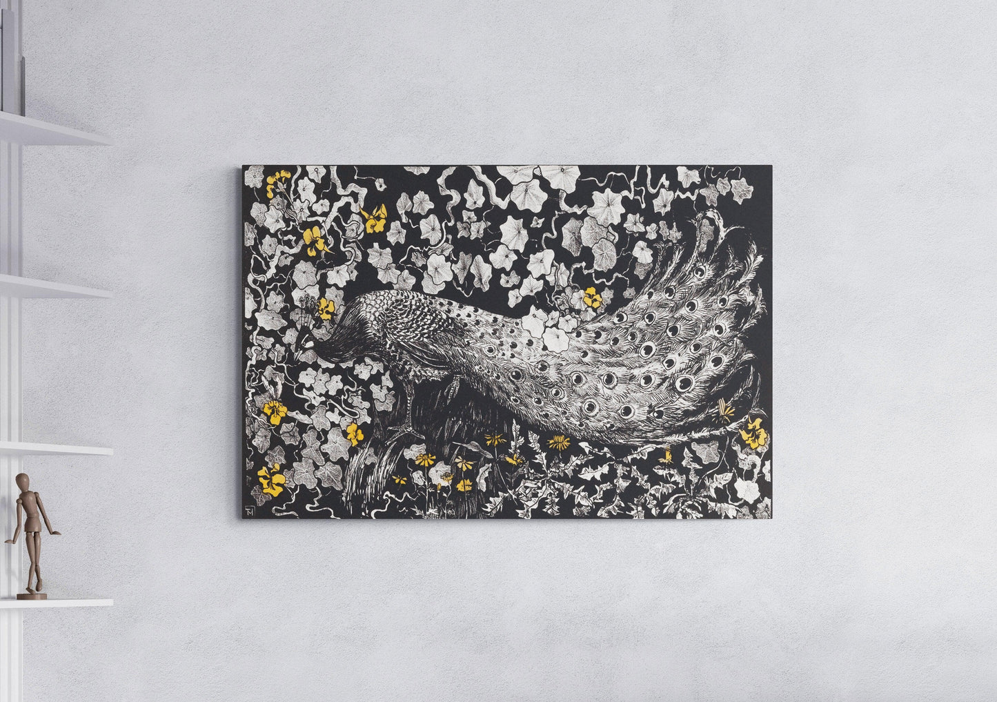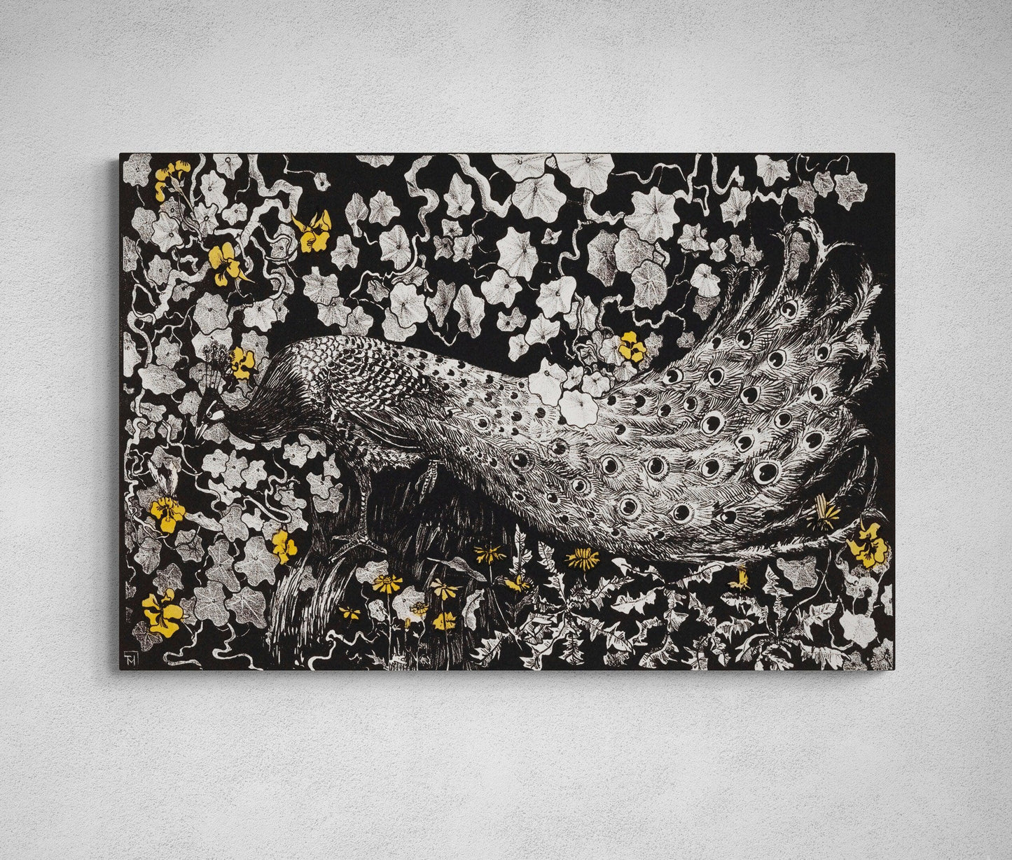 Vintage Print by Theo Van Hoytema. Peacock Black and White Print with Floral Background. Art Print (Pauw)