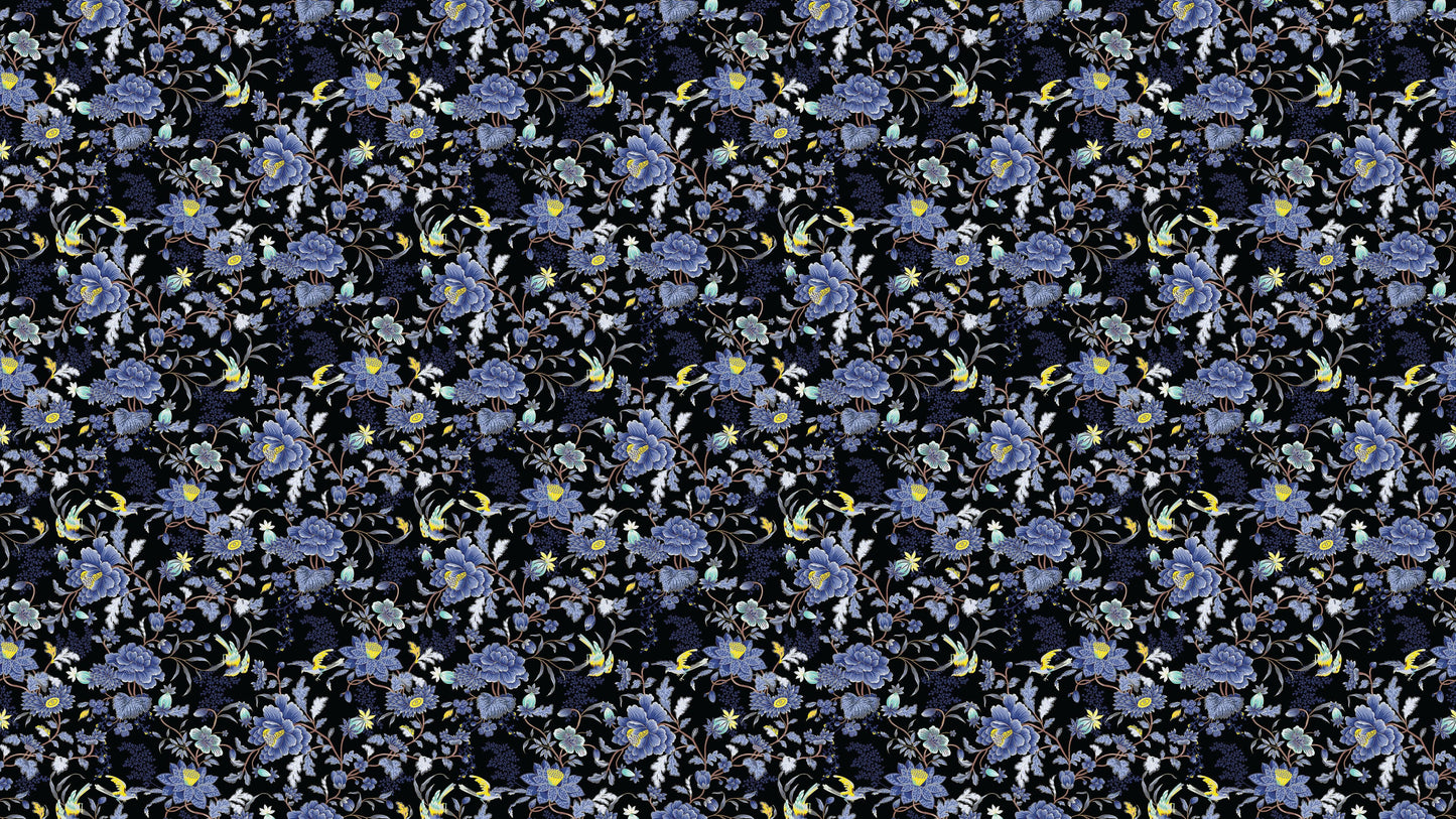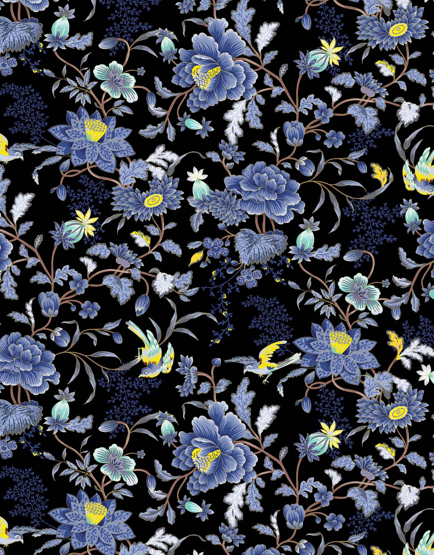 Blue and Black Color Flower Pattern Wall Mural. Tropical Botanical Floral Peel and Stick Wallpaper. #6437