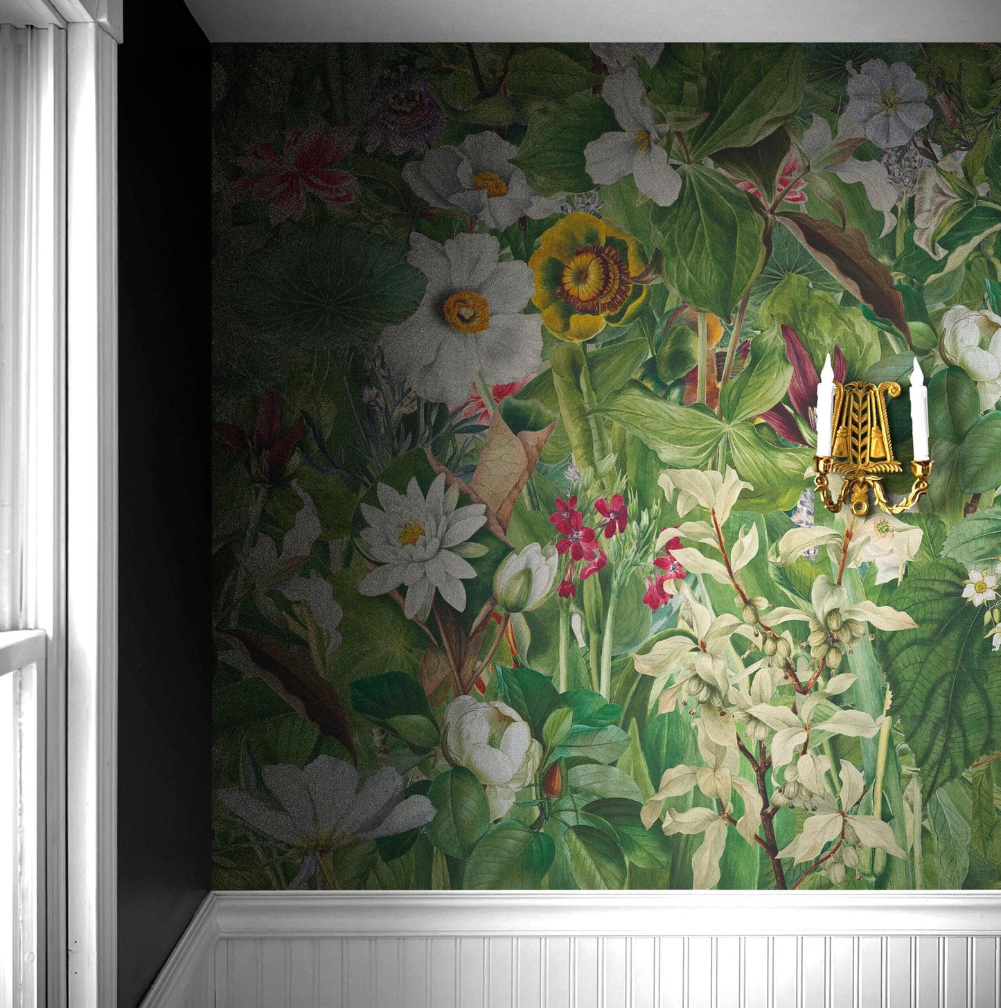 Botanical Vegetation Garden Wall Mural. Color Pencil Artwork of Flower Garden Peel and Stick Wallpaper. Rainforest Jungle Botanical Flowers and Leafs Background. #6449
