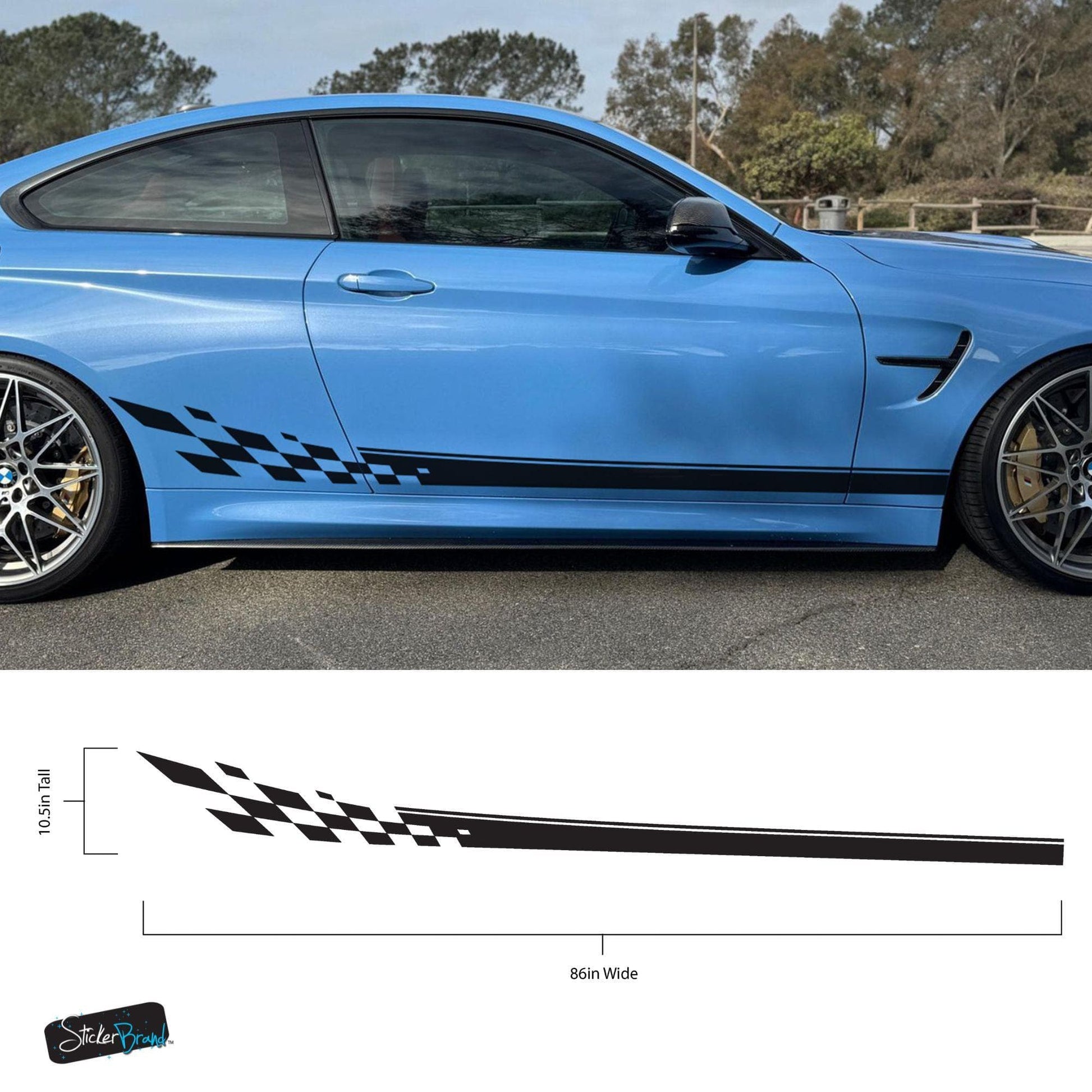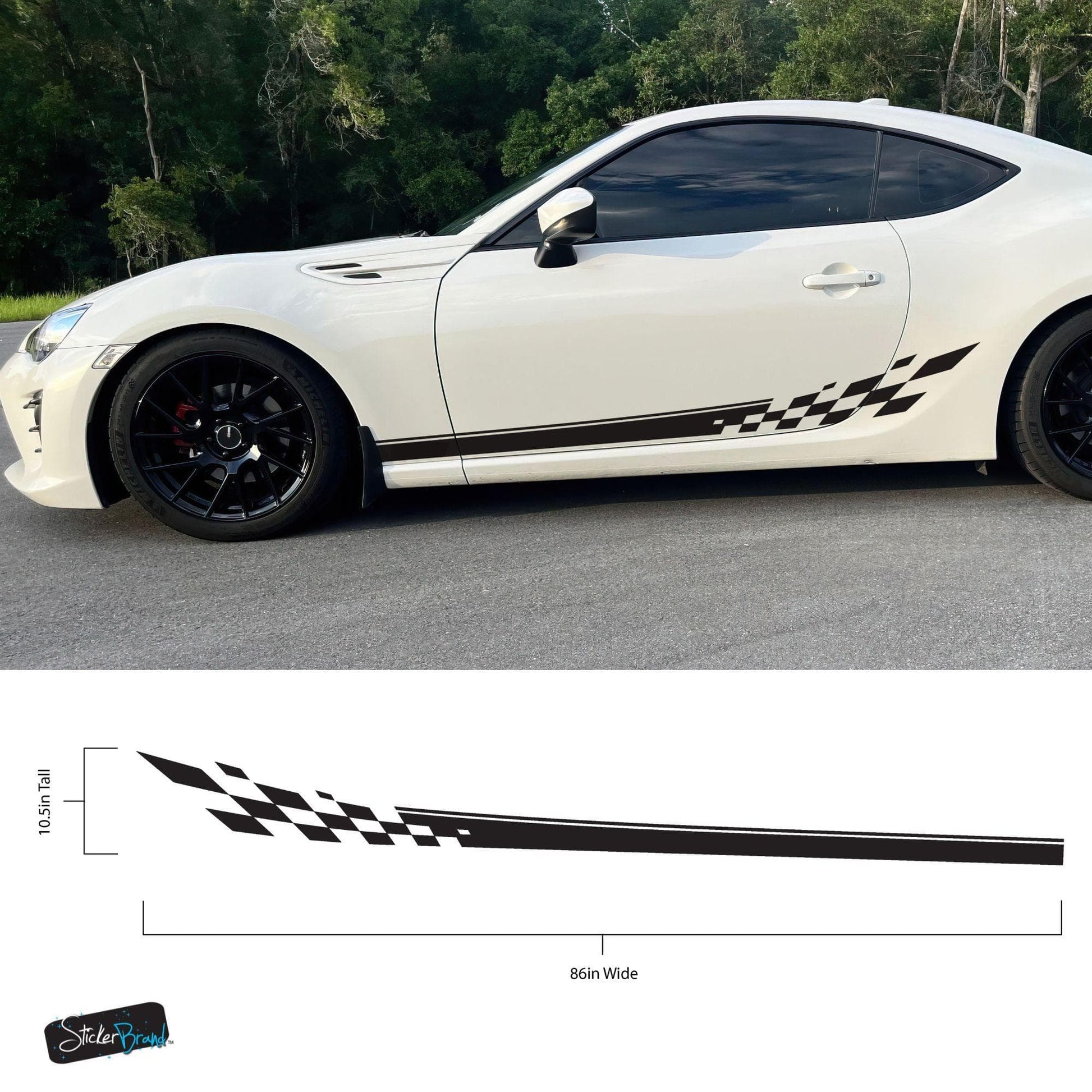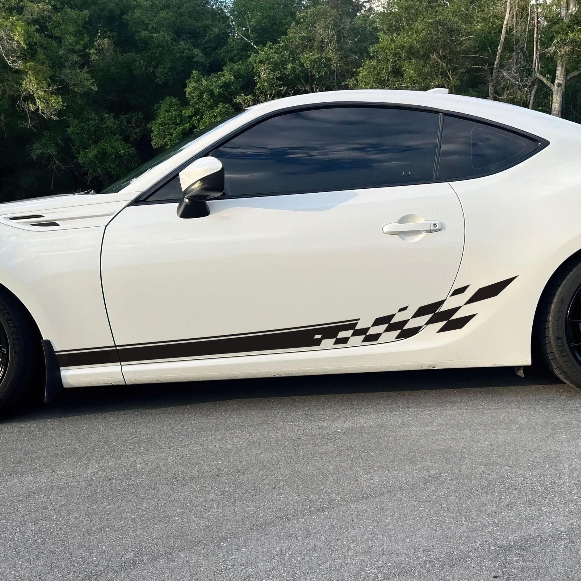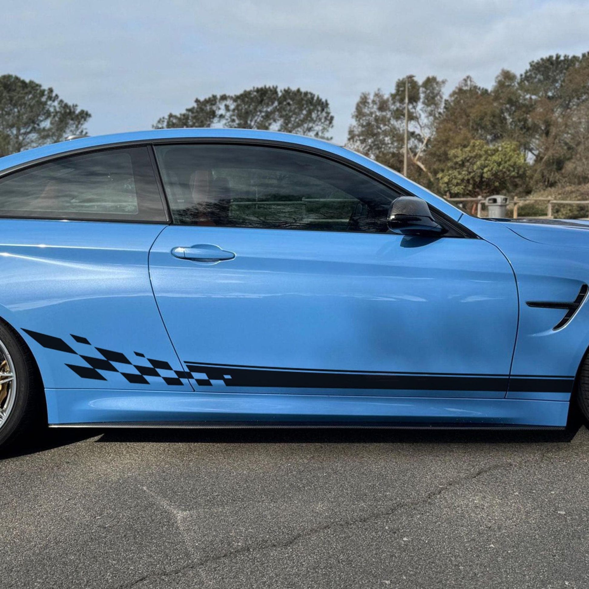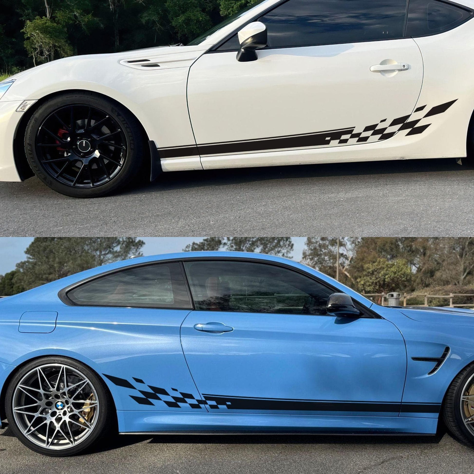 Most of our car graphic decals are designed as universal fits, which means some trimming will be required during installation. You may need to trim around doors, fenders, and other features of your vehicle to achieve the best fit.