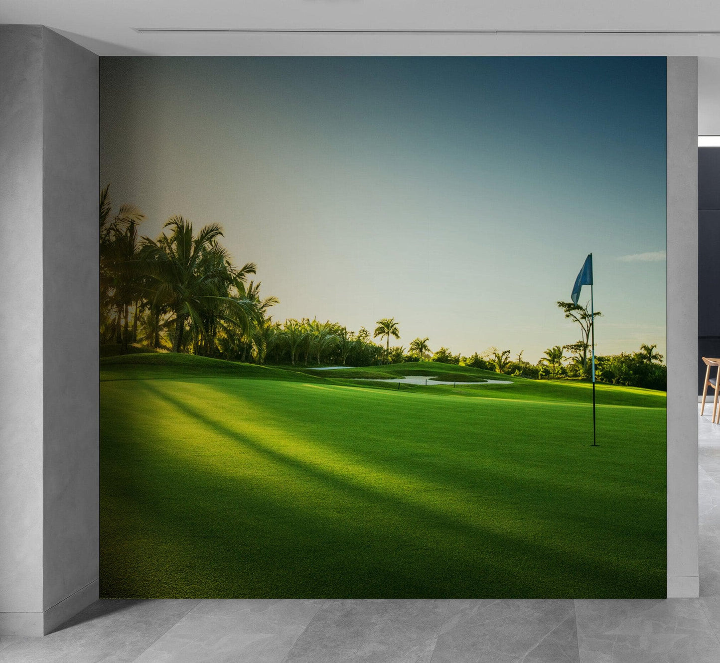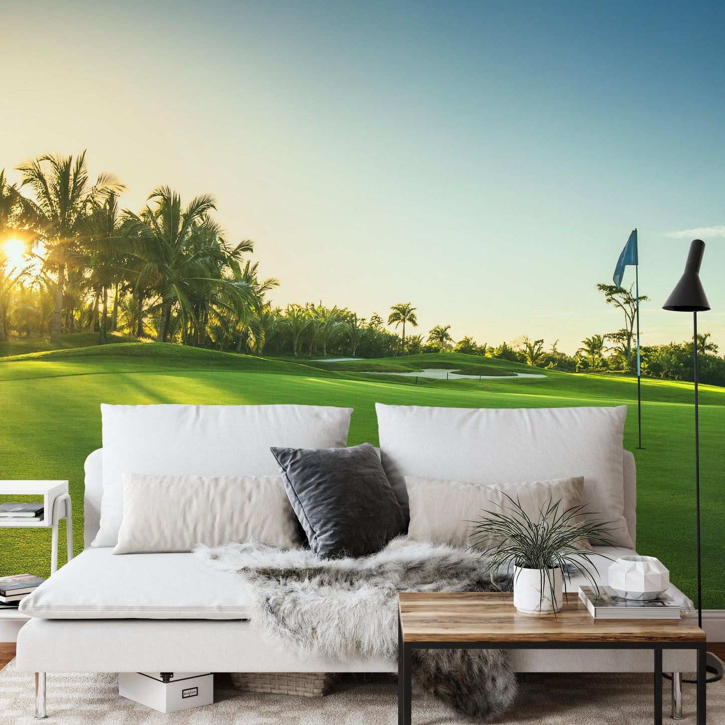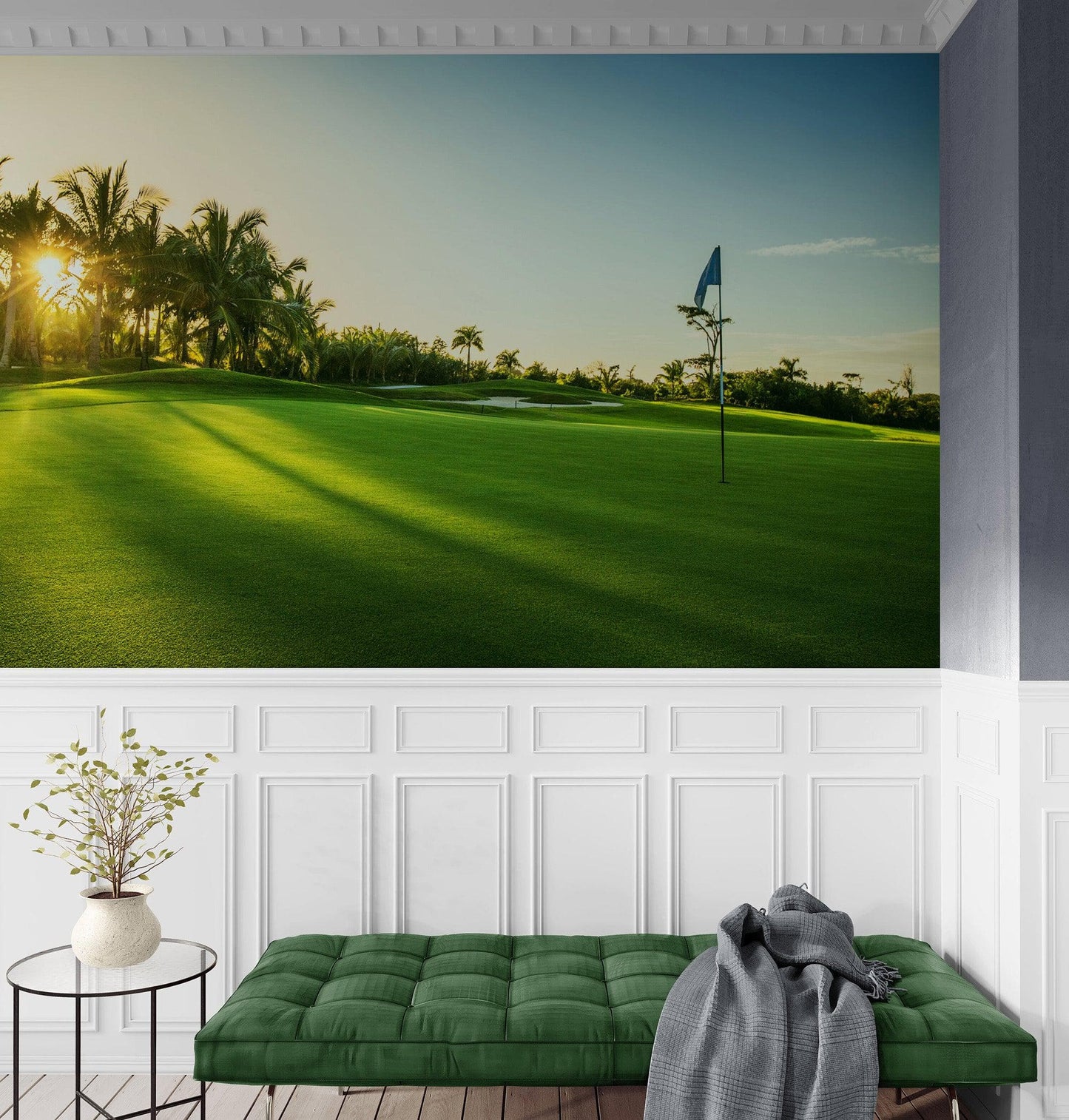 Transform your space with our Beautiful Golf Course Green Wallpaper Mural, featuring a breathtaking sunset over a lush green course with palm trees in the background. Perfect for living rooms, home offices, recreational areas, golf clubs, and sports bars, this mural adds a serene and scenic touch to any environment.