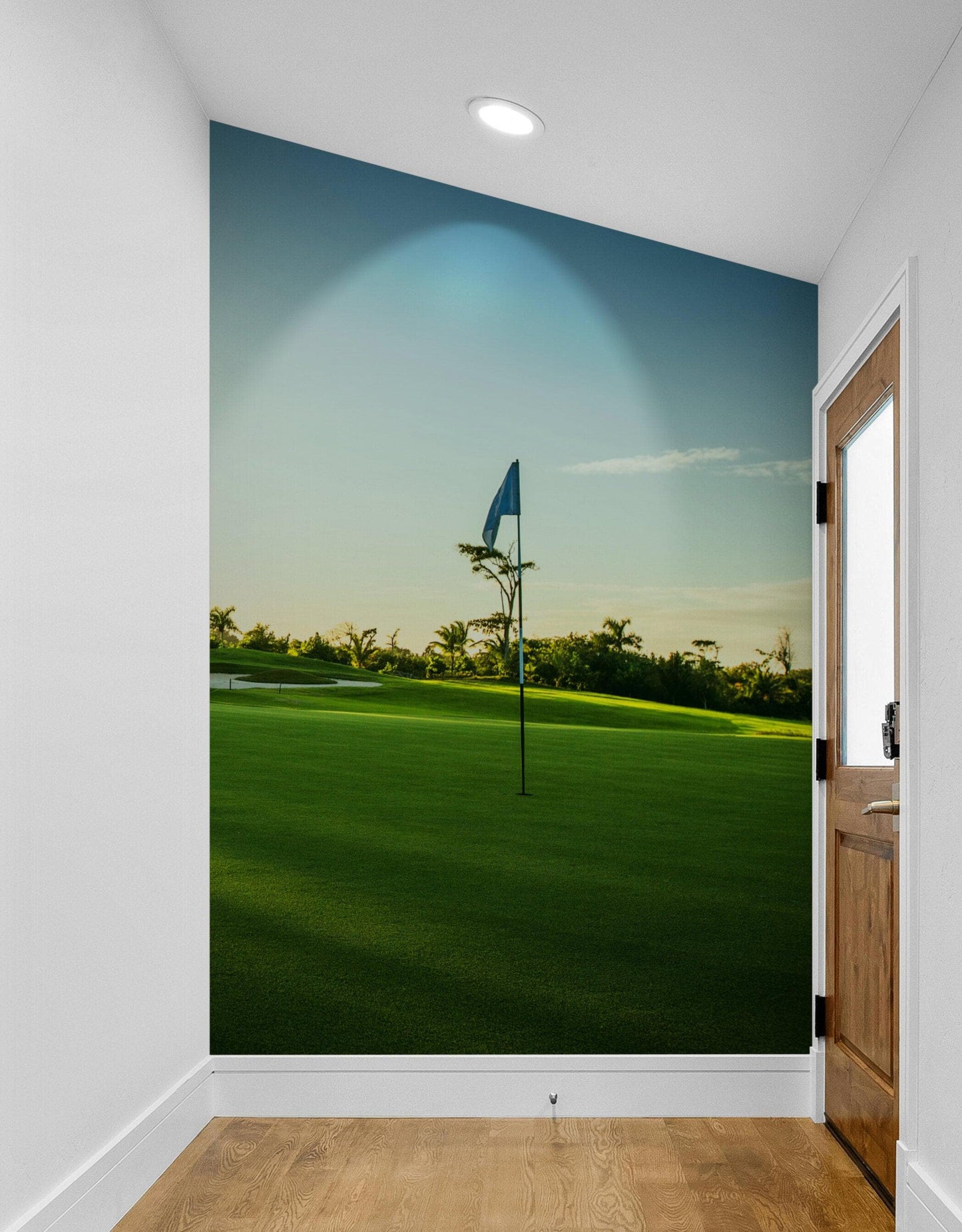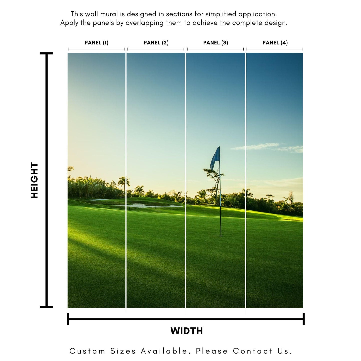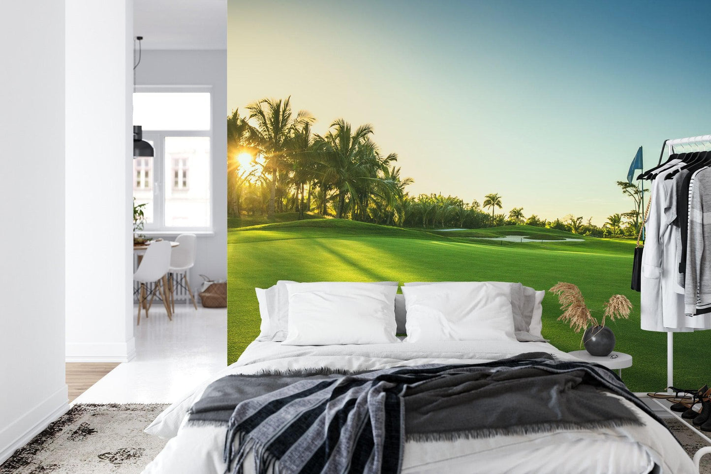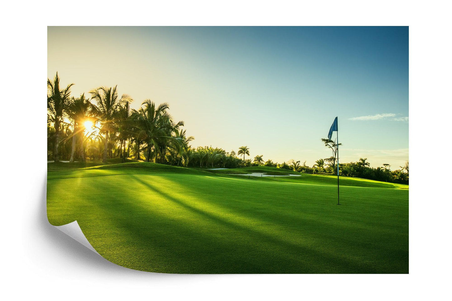 Transform your space with our Beautiful Golf Course Green Wallpaper Mural, featuring a breathtaking sunset over a lush green course with palm trees in the background. Perfect for living rooms, home offices, recreational areas, golf clubs, and sports bars, this mural adds a serene and scenic touch to any environment.