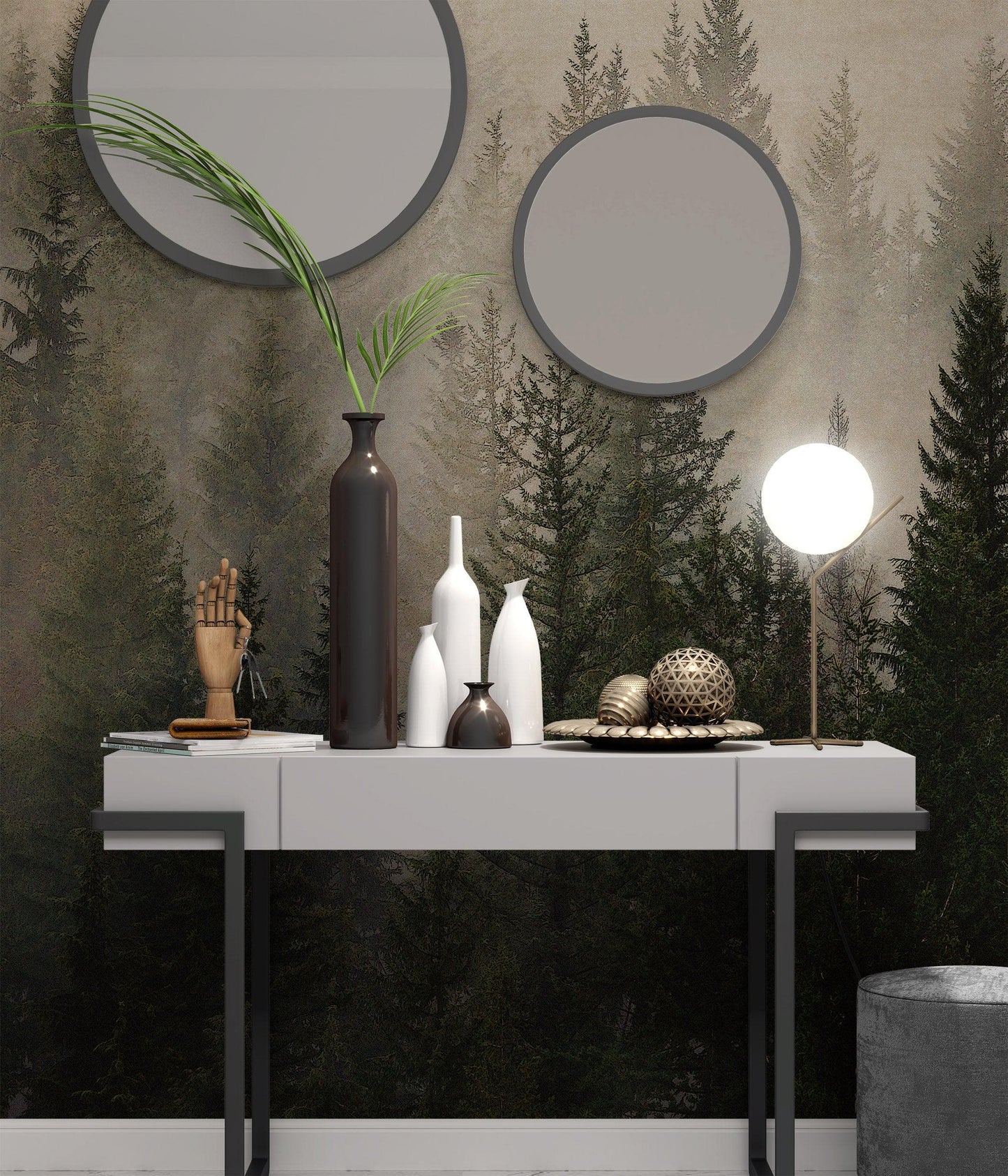 - Misty foggy forest wall mural. Perfect for the nursery room. Beautiful Destination to get to. Add this Calm Scenery View to your bedroom.