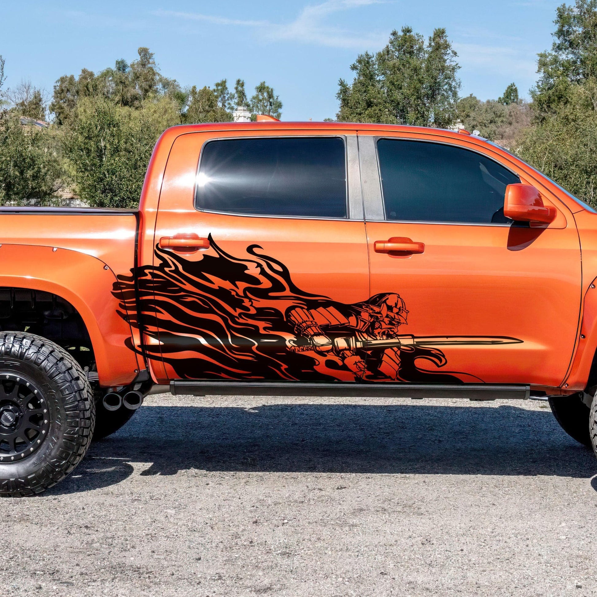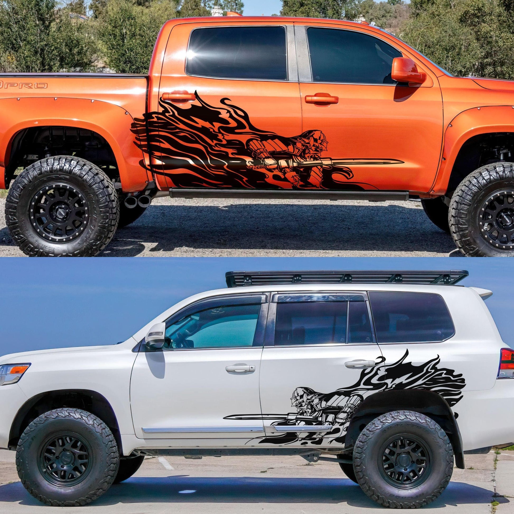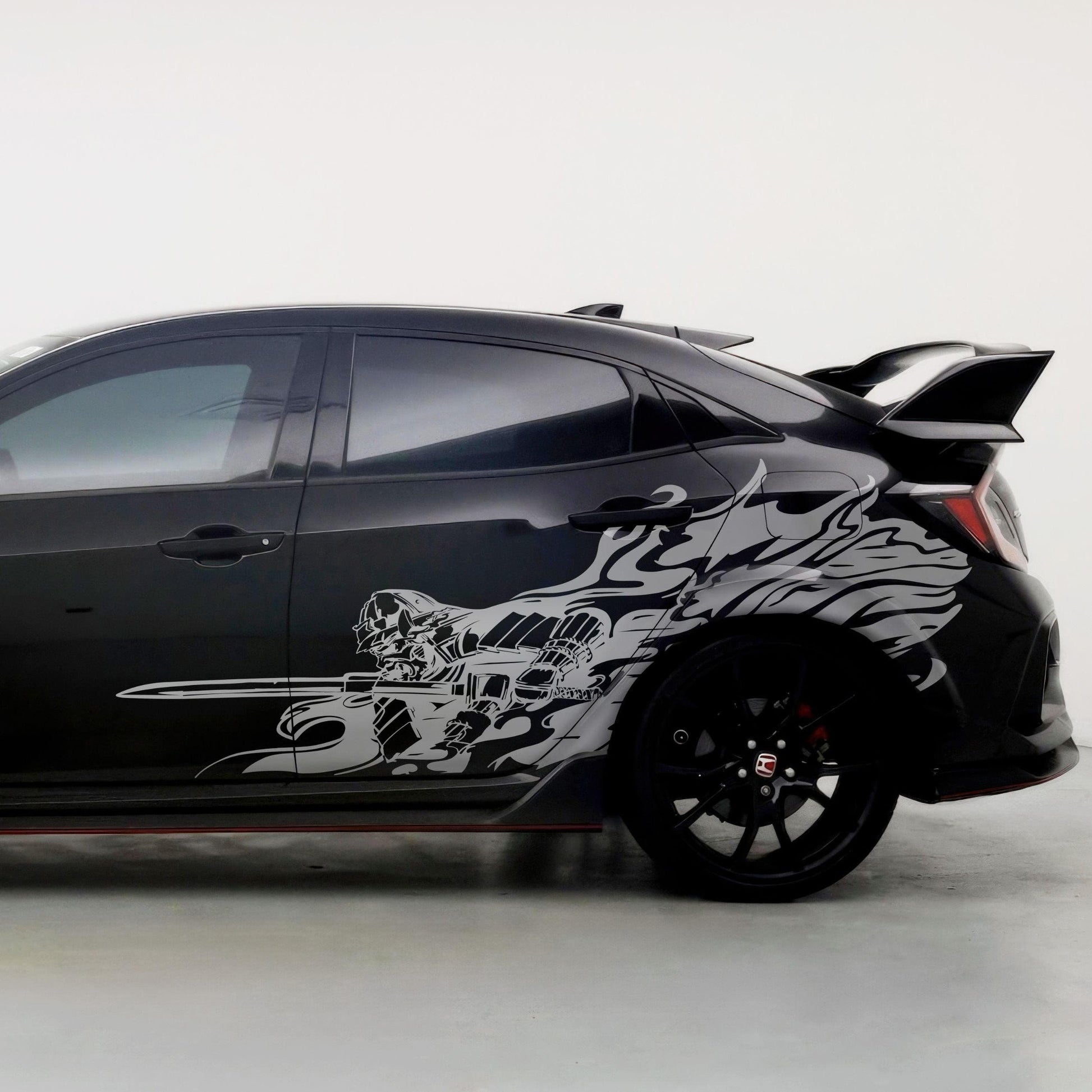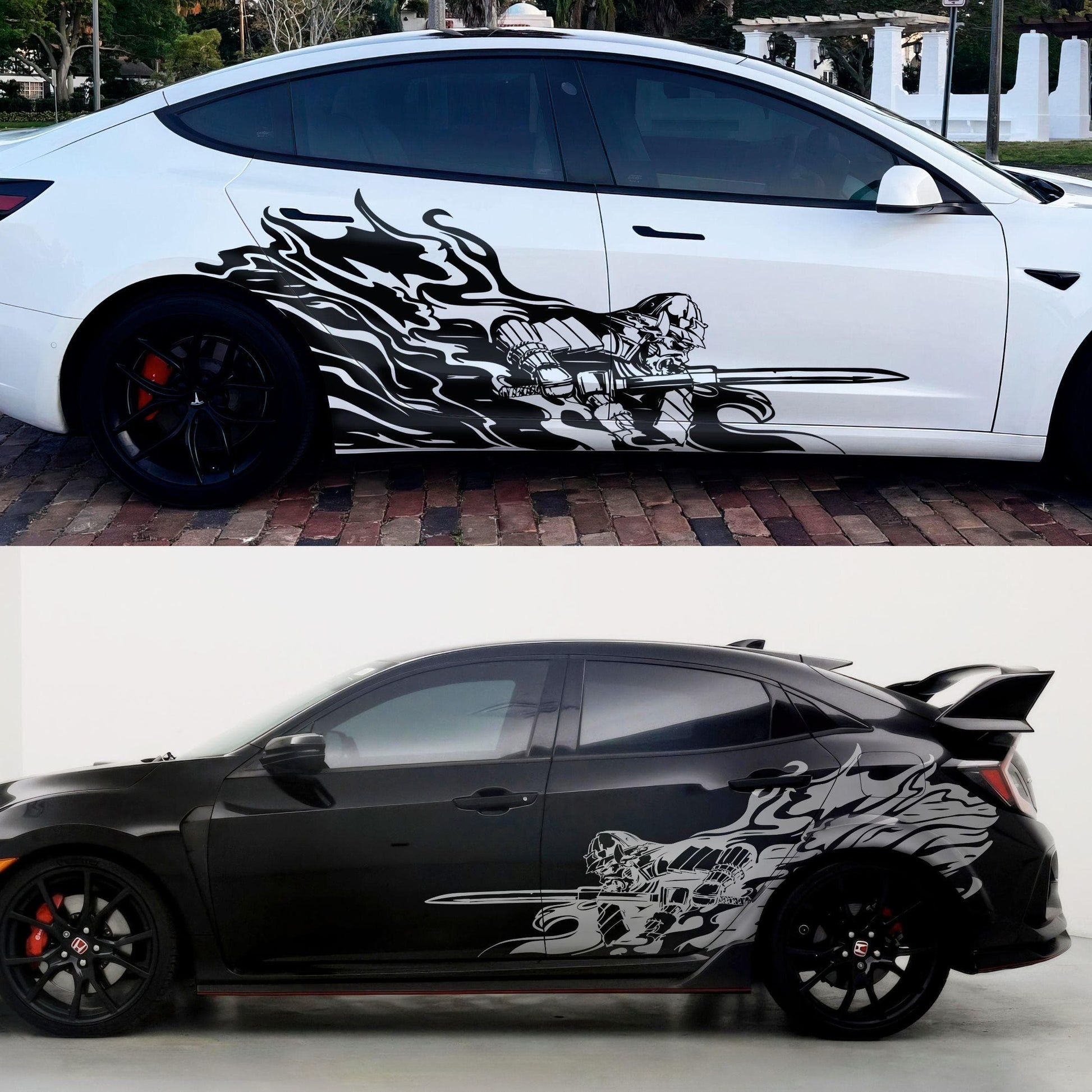 Most of our car graphic decals are designed as universal fits, which means some trimming will be required during installation. You may need to trim around doors, fenders, and other features of your vehicle to achieve the best fit.